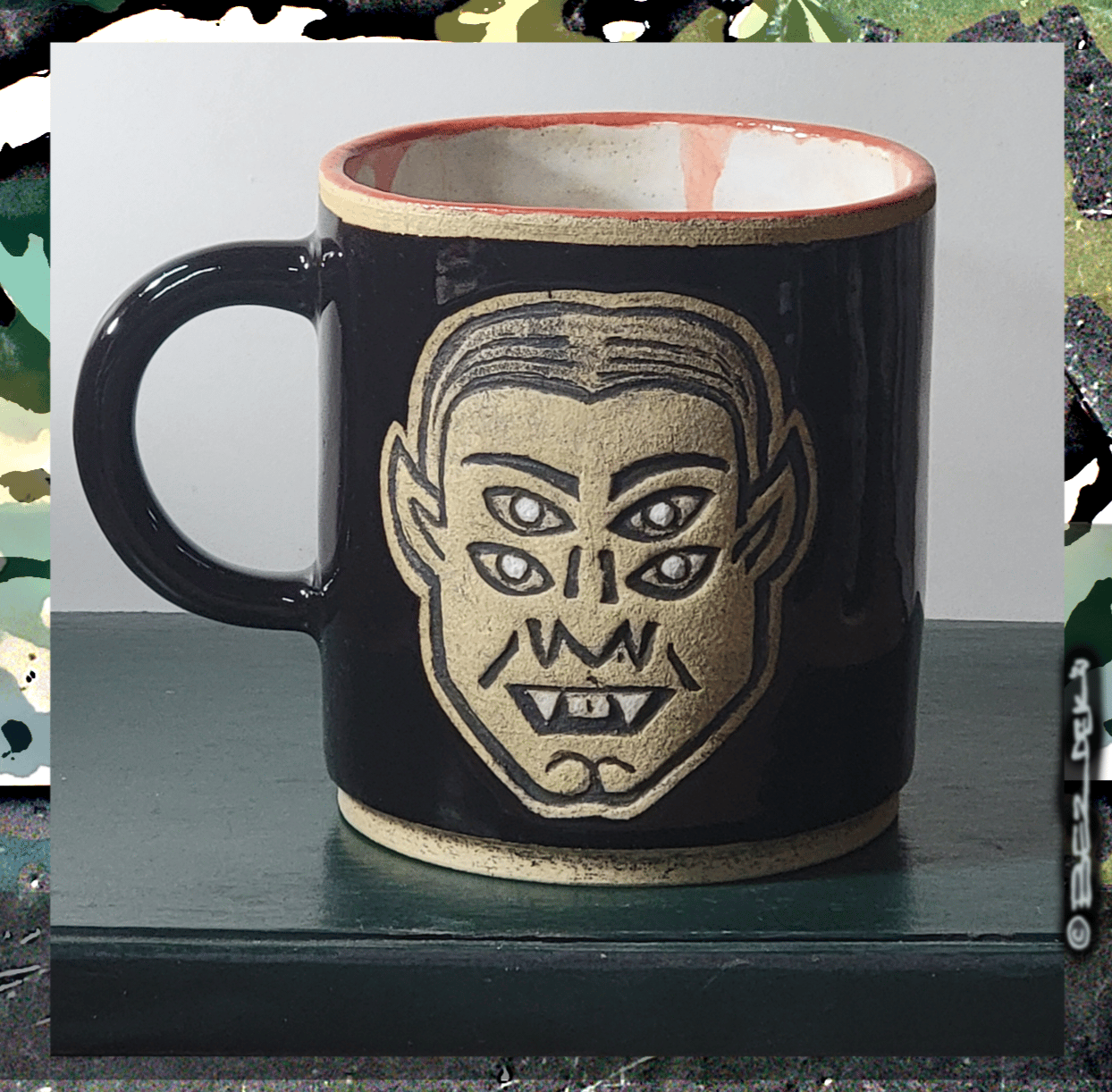 Matte black vampire design on both sides of a wide-mouth, gloss black cup. Inside is gloss white with hints of red.